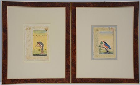 Ignoto, "Pennuti su rami" coppia di tempere su carta (cm 22x16) in cornice...