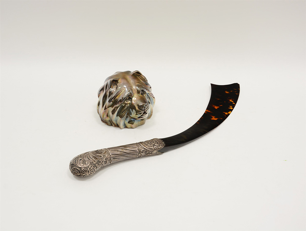 Lotto composto da un tagliacarte a forma di sciabola con impugnatura in argento (lungh. cm 35) unito a un fermacarte in resina argentata raffigurante una testa di cane in resina argentata marcato Faraone (difetti)