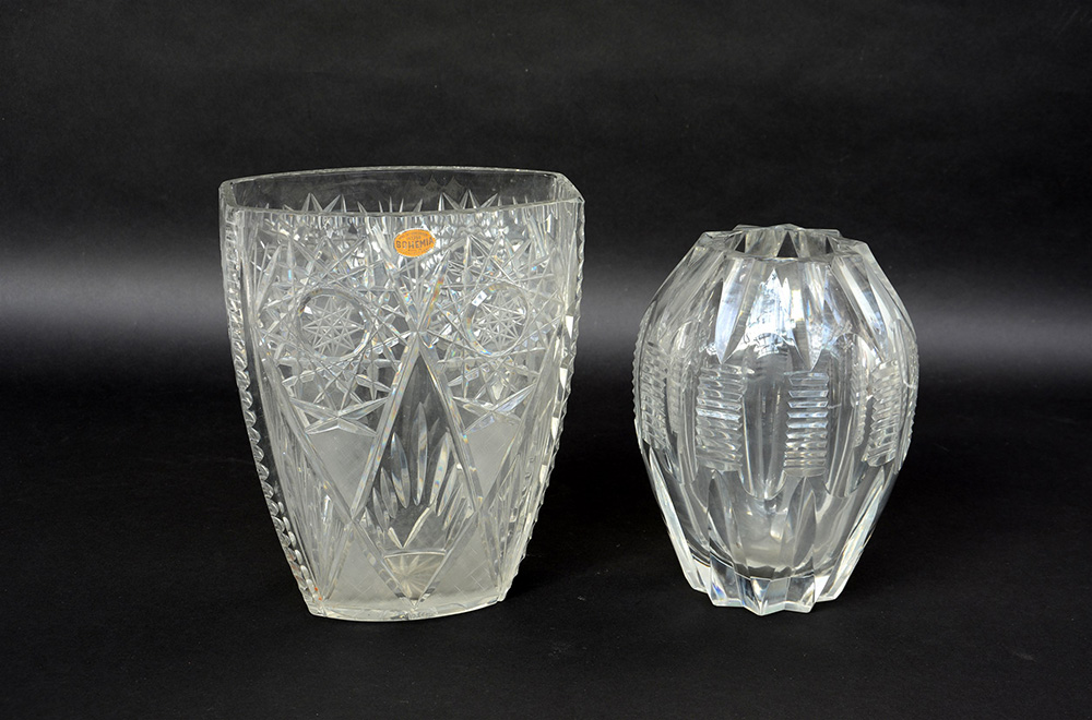 Manifattura di Boemia, lotto di due vasi in cristallo sfaccettato di forme differenti (h max cm 28,5) (difetti)