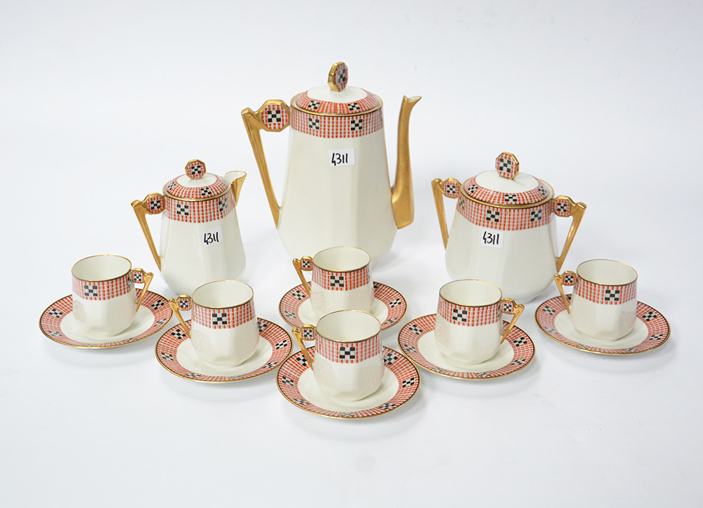Manifattura di Limoges Chabrol et Poirier. Parte di servizio da thè e caffè in porcellana a decoro geometrico e profili dorati