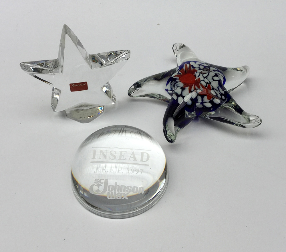 Lotto di tre fermacarte in vetro di forme, manifatture e tecniche diverse. Esecuzione recente. (misure varie)