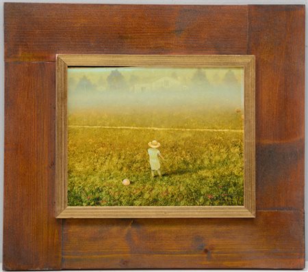 Firma indecifrata "Figura nel campo fiorito" olio su cartone (cm...
