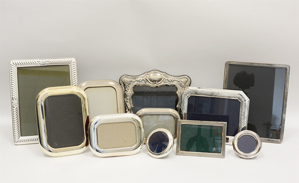 Lotto compostoundici cornici da tavolo moderne diverse in metallo argentato e argento (difetti)