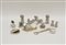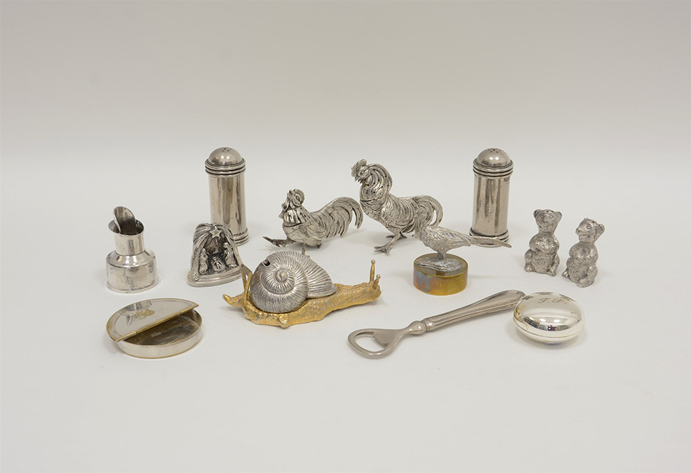 Lotto composto da sei scatoline di cui quattro a forma d'animali, un portapillole, un salvagoccia, un apribottiglia, un posacenere, un piccolo presepe ed un porta scotch da tavolo a forma di lumaca, in metallo argentato e argento (difetti e mancanze)
