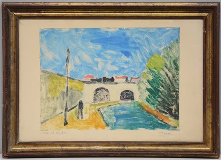"Ponte sul Naviglio" monotipo (cm 42x63) firmato in basso a destra, in cornice
