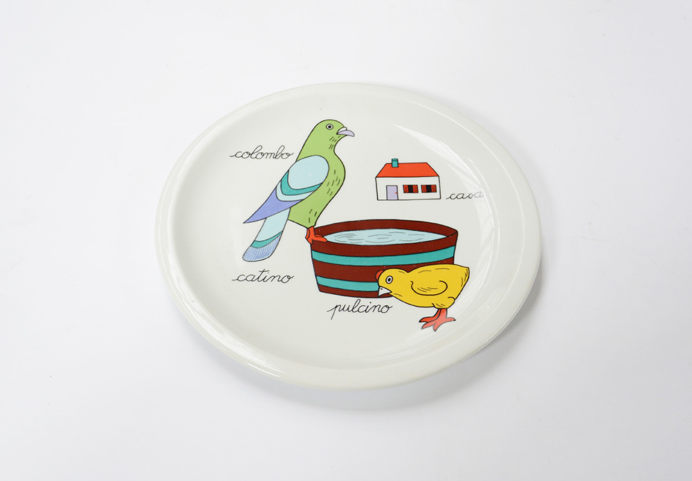 Piatto in porcellana con decoro elementare policromo. Multiplo 491/500 Firmato e datato al verso "Remo Bianco '85" (d cm 28,5)