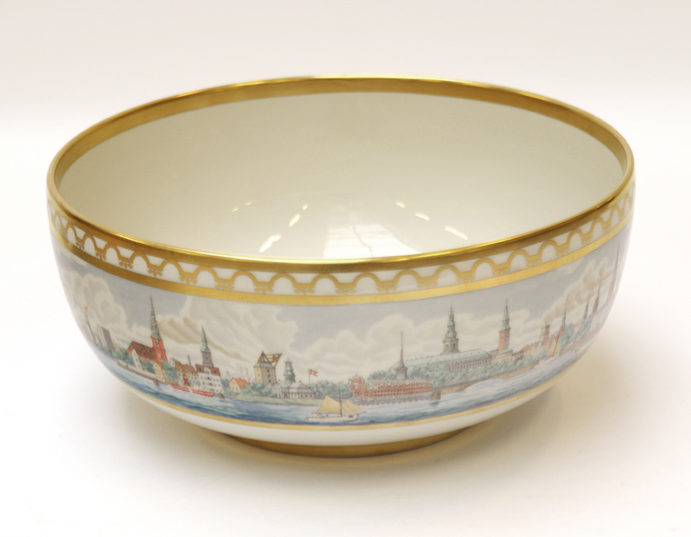 Centrotavola in porcellana con fascia decorata a paesaggio e filettature in oro realizzata in occasione del bicentenario della fondazione della manifattura. Danimarca, 1975. Numerata 1538/2500 sotto la base. (d cm 33)