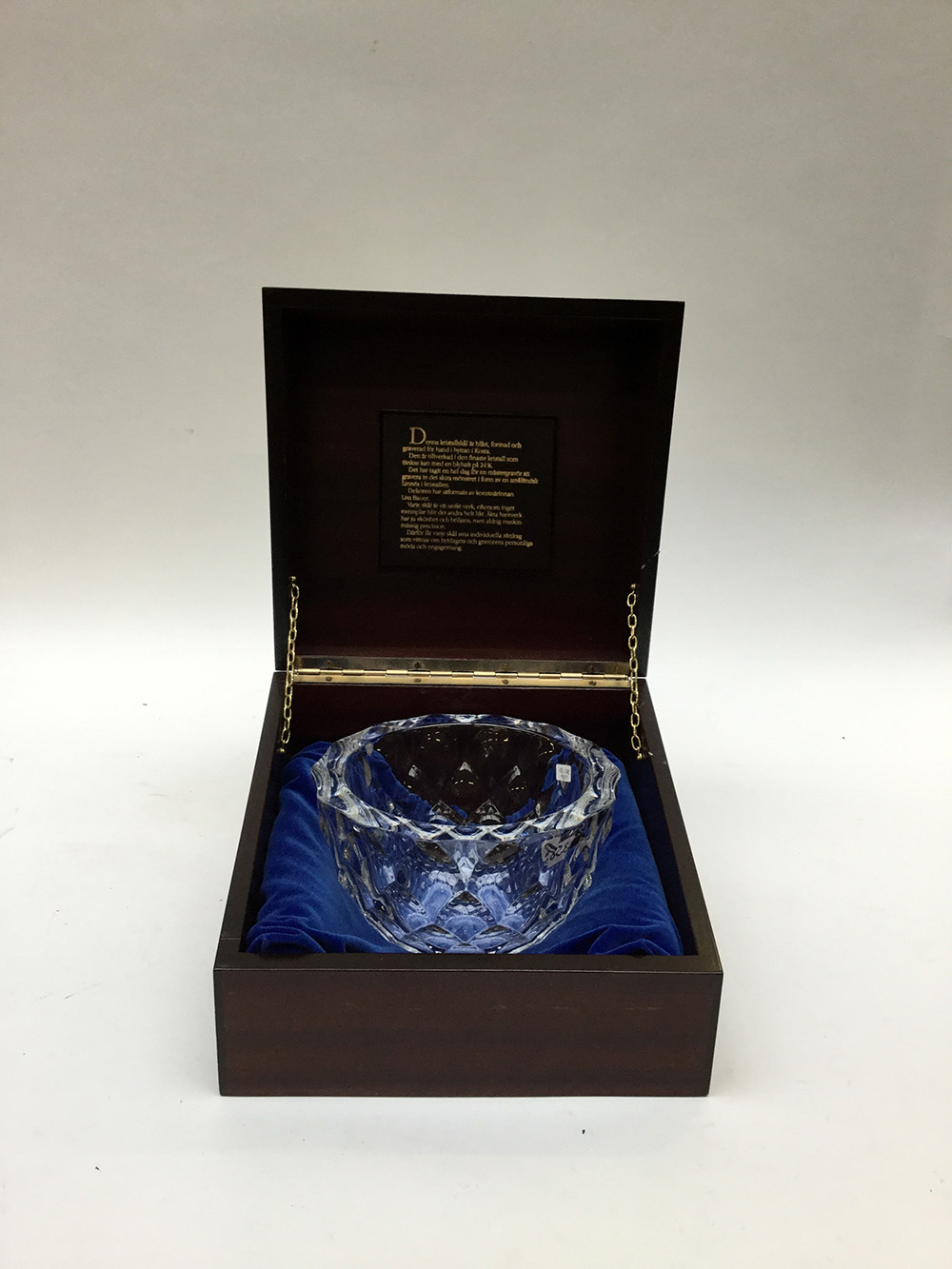 Centrotavola in vetro sfaccettato in scatola in legno. Svezia, produzione recente.