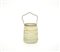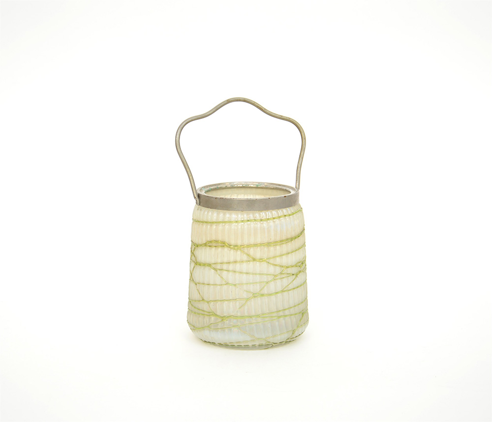 Cestello in vetro soffiato costolato opalescente e iridescente con applicazione di fili verdi. (h cm 15 d cm 10) (gravi difetti e mancanze)