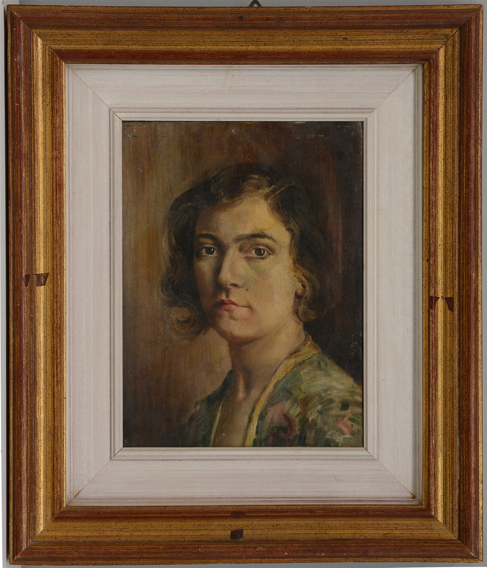 Firma indecifrata, "Ritratto di donna" olio su cartone telato (cm 40x30) firmato e datato 1929 in basso a destra. Iscritto e datato al retro, in cornice (difetti)