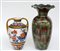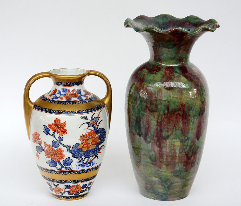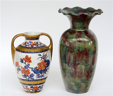 Lotto composto da un vaso ad anfora in ceramica dipinta a fiori con fasce dorate ed un vaso in ceramica dipinto nei toni del verde e rosso (h max cm 33) (difetti)