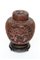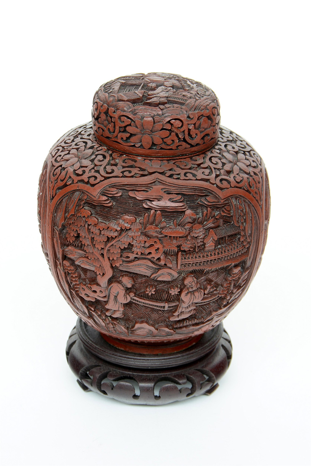 Potiche con coperchio in resina rossa decorato con paesaggi e figure intagliate, base in legno (lievi difetti)
