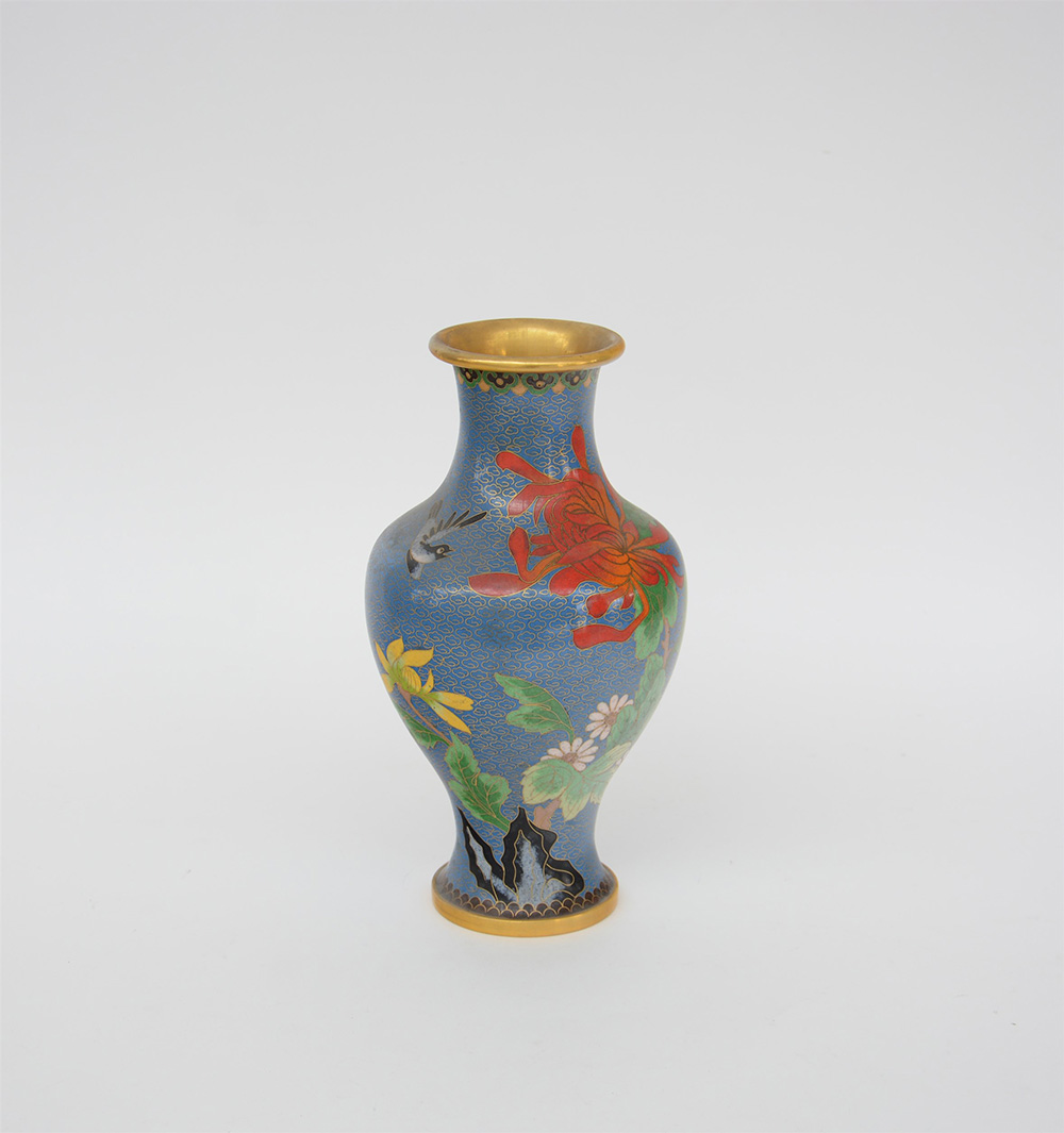Vaso in metallo cloisonné decorato con fiori su fondo turchese (difetti)