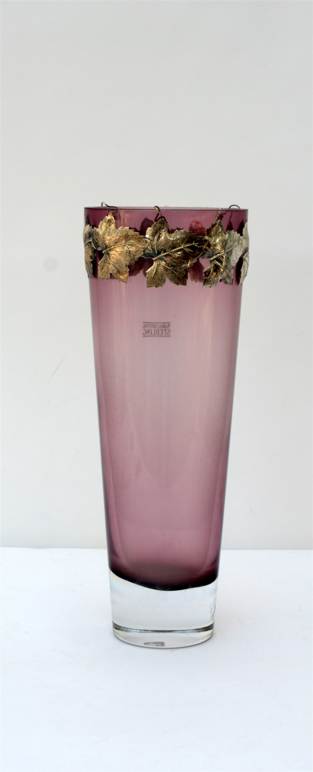 Vaso restremato in vetro color ametista decorato con ghiera applicata a foglie di vite in argento, marcato Maria Cristina Sterling (h cm 40)