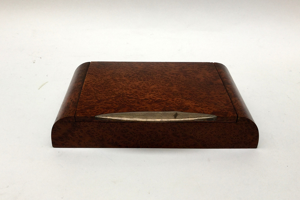 Portasigarette da tavolo decò in radica e argento. Italia, anni '30. (cm 28x5,5x16,5) (difetti)