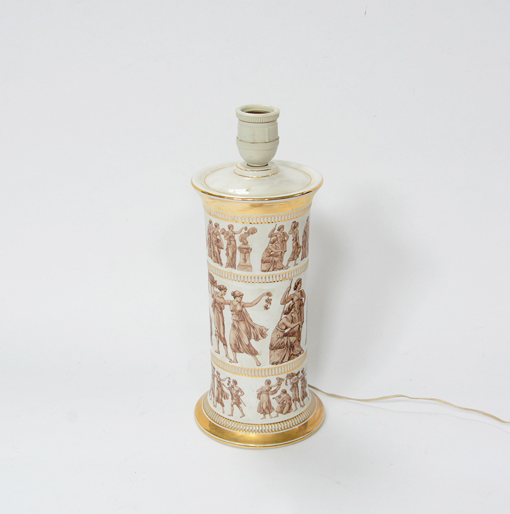 Lampada da tavolo in ceramica smaltata in monocromia con figure classiche e profilata in oro. Firmata sotto la base "Fiorentino MADE IN ITALY". (h cm 30) (lievi difetti)
