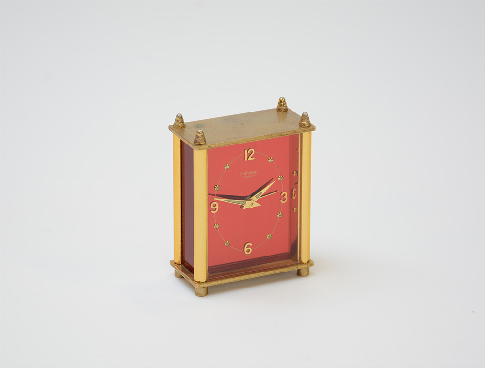 Orologio da viaggio con sveglia a carillon di forma rettangolare, quadrante rosso (h cm 7,5) (difetti, non funzionante)