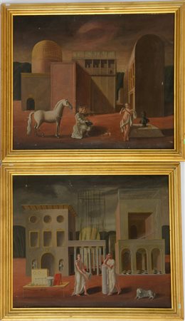 Ignoto "Paesaggio con figure classiche" coppia di dipinti ad olio su tela (cm 50x60) in cornici (difetti)