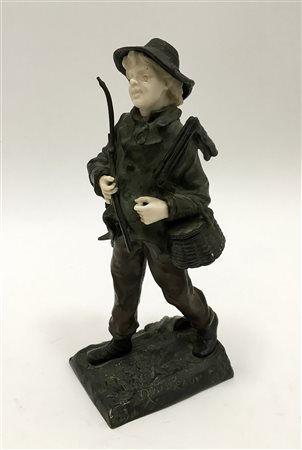 "Cacciatore" scultura in bronzo con viso e mani crisoelefantine (h cm 27) Firmata alla base (difetti e mancanze)