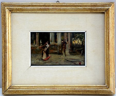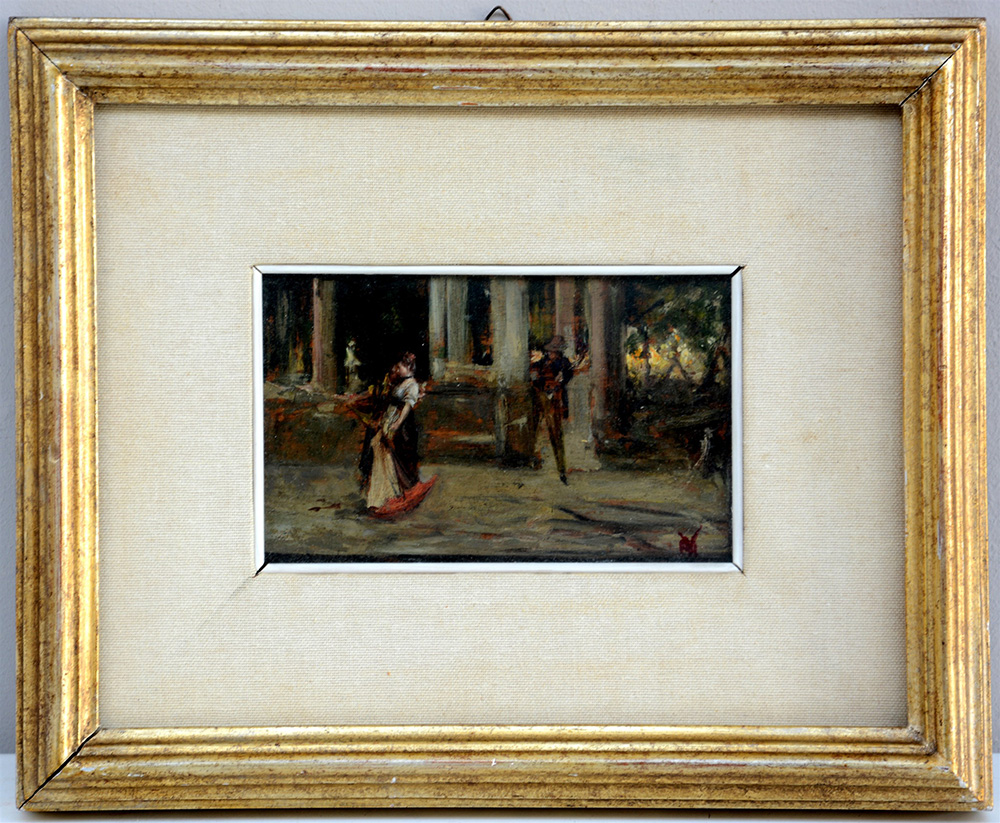 Scuola del secolo XIX "Figure in un paesaggio" olio su tavoletta (cm 12x19) siglato in basso a destra. In cornice
