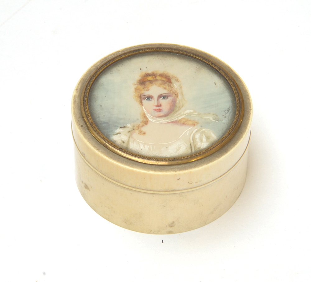 Tabacchiera tonda in avorio con coperchio decorato da una miniatura firmata, raffigurante una dama bionda con abito bianco (d cm 7)