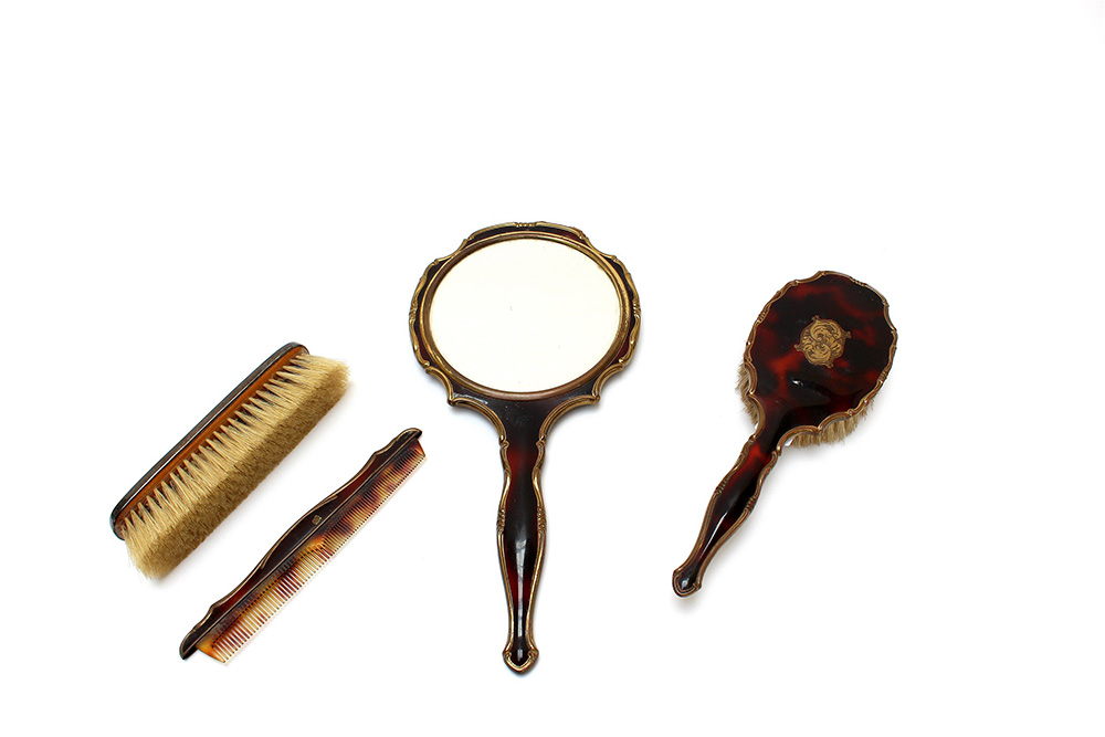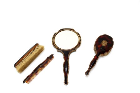 Set da toilette in finta tartaruga e metallo color oro composto da uno specchio a mano, un pettine, e due spazzole (difetti)