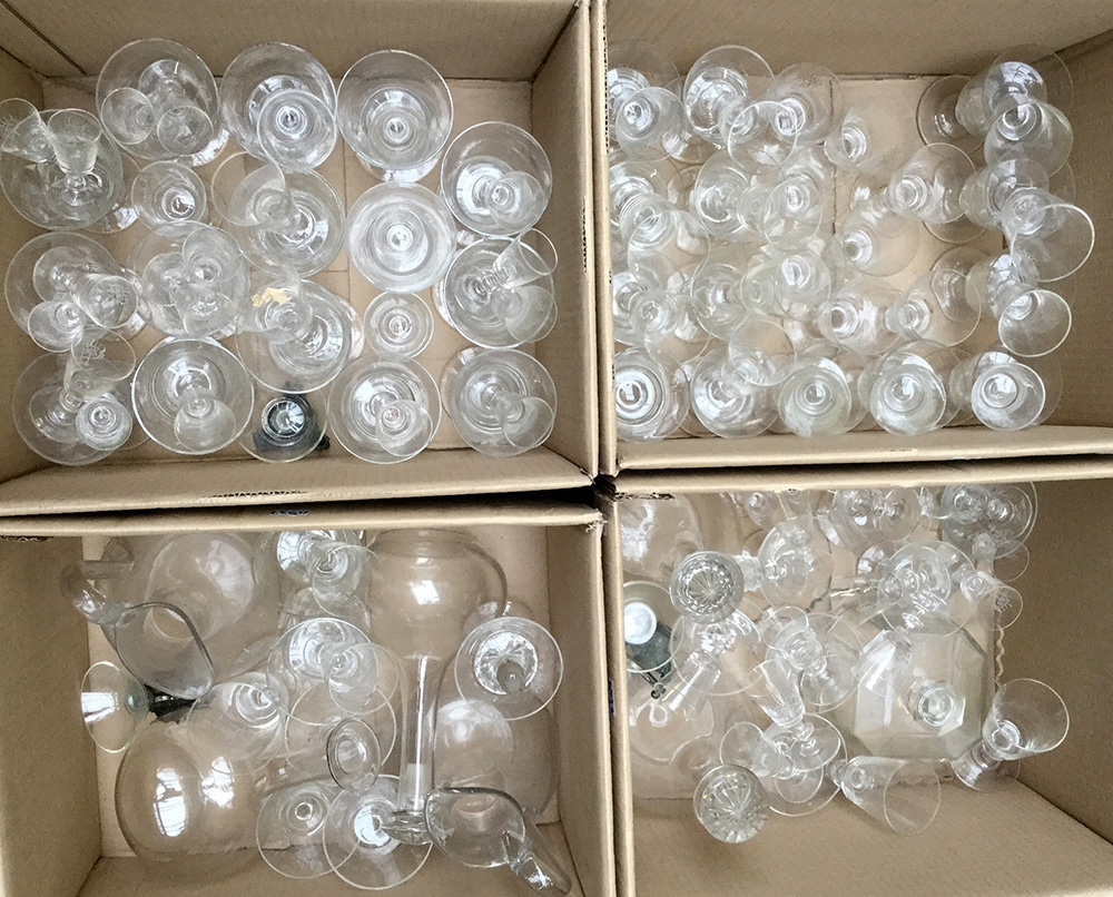 Lotto di quattro cartoni contenenti numerosi bicchieri ed altri oggetti in cristallo con monogrammi (difetti)