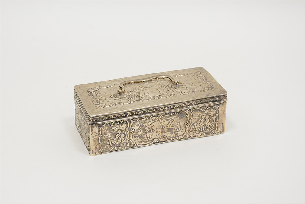 Cofanetto in argento di forma rettangolare decorato con scene di vita agreste e allegoriche con dedica incisa. Olanda, fine secolo XIX (cm 14x6) (g 220 ca.) (difetti)