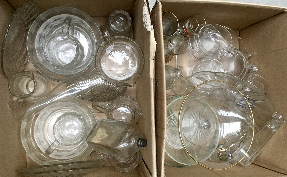 Lotto di due cartoni contenenti numerosi oggetti per la tavola in vetro (difetti)