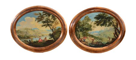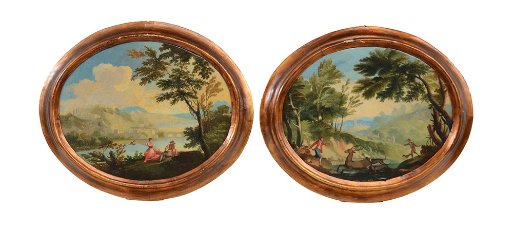 Coppia di antichi dipinti ovali ad olio su tela (cm 35x44) raffiguranti "Scena di caccia" e "Scena romantica", in cornici (lievi difetti)
