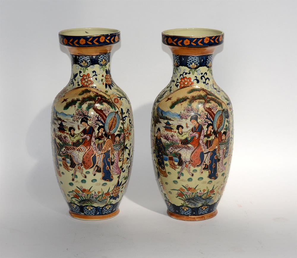 Coppia di vasi in ceramica dipinta in stile Satsuma con fiori e scene di genere (lievi difetti)