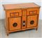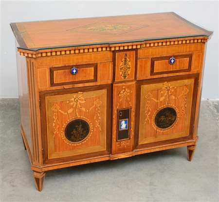 Credenza lastronata in satinwood e filettata in legno chiaro a motivi geometrici a tre cassetti, di cui quello centrale intarsiato a motivi vegetali. Due sportelli intarsiati a medaglioni tondi ebanizzati decorati con paesaggi e fiori e intarsiati con nastro, parte centrale decorata con placchetta wedgwood a motivo neoclassico, piano intarsiato a motivi vegetali entro cornice romboidale e piedi troncopiramidali. Inghilterra prima metà del secolo XIX (cm 118x90x60) (difetti)