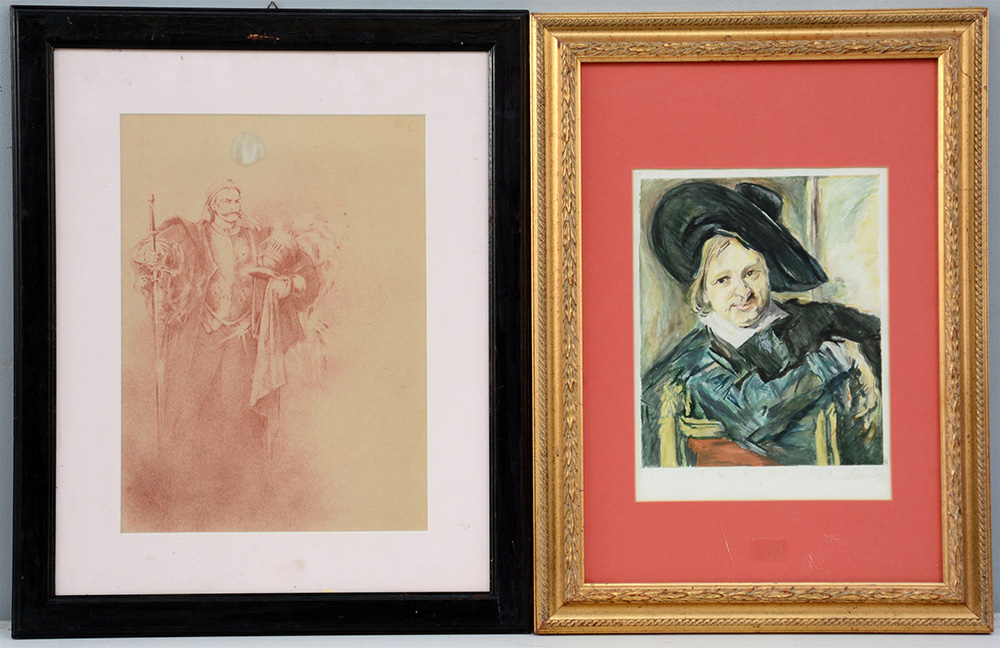Lotto composto da una tecnica mista raffigurante un moschettiere ed una sanguigna raffigurante un condottiero, autori e misure differenti, in cornici (difetti)
