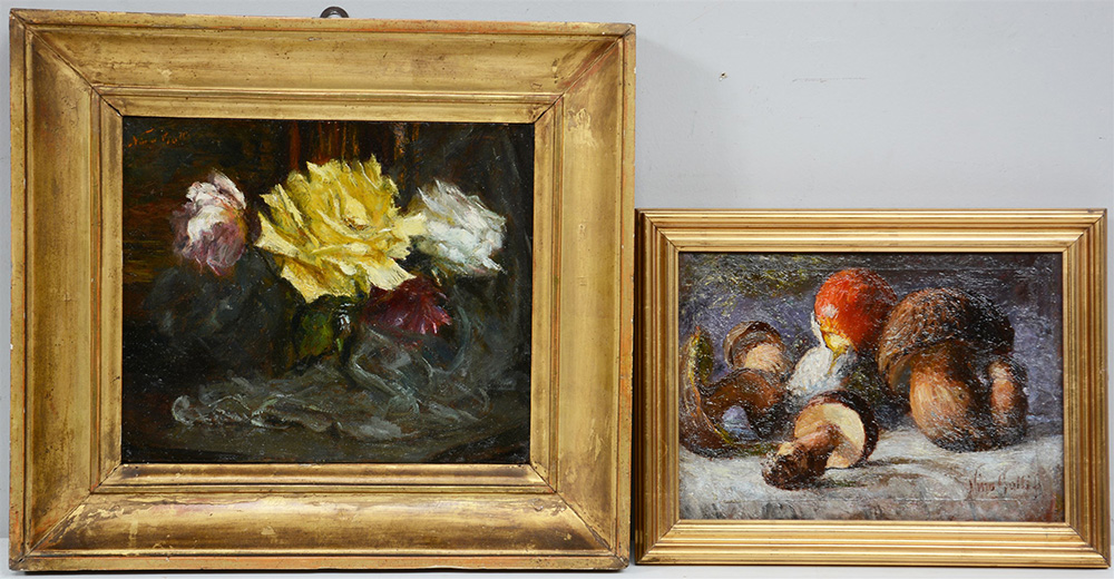 Nina Galli Lotto di due olii raffiguranti funghi e rose, firmato in basso a...