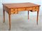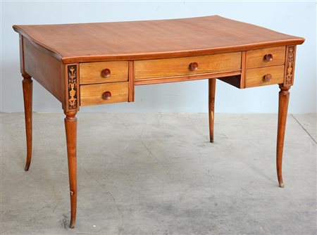 Scrittoio doppio in legno dolce con piano mosso, gambe tornite decorato da piccoli intarsi con cinque cassetti su ciascun lato lungo, fine anni ‘30 (cm 121x78x84) (difetti e mancanze)