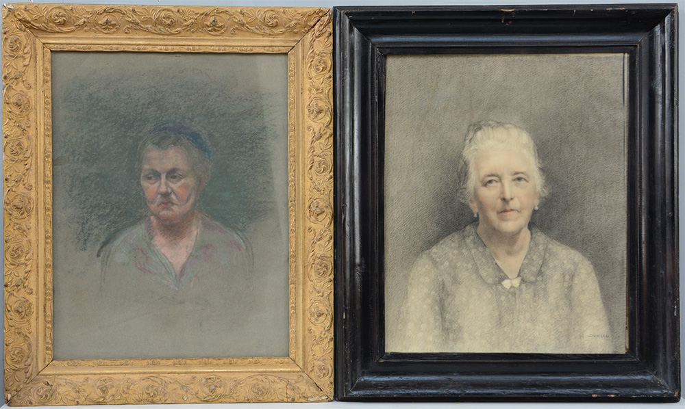 Lotto di due pastelli su carta raffiguranti ritratti femminili (cm 65x50) uno firmato Alfred Duriau, in cornici (difetti)