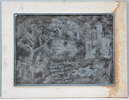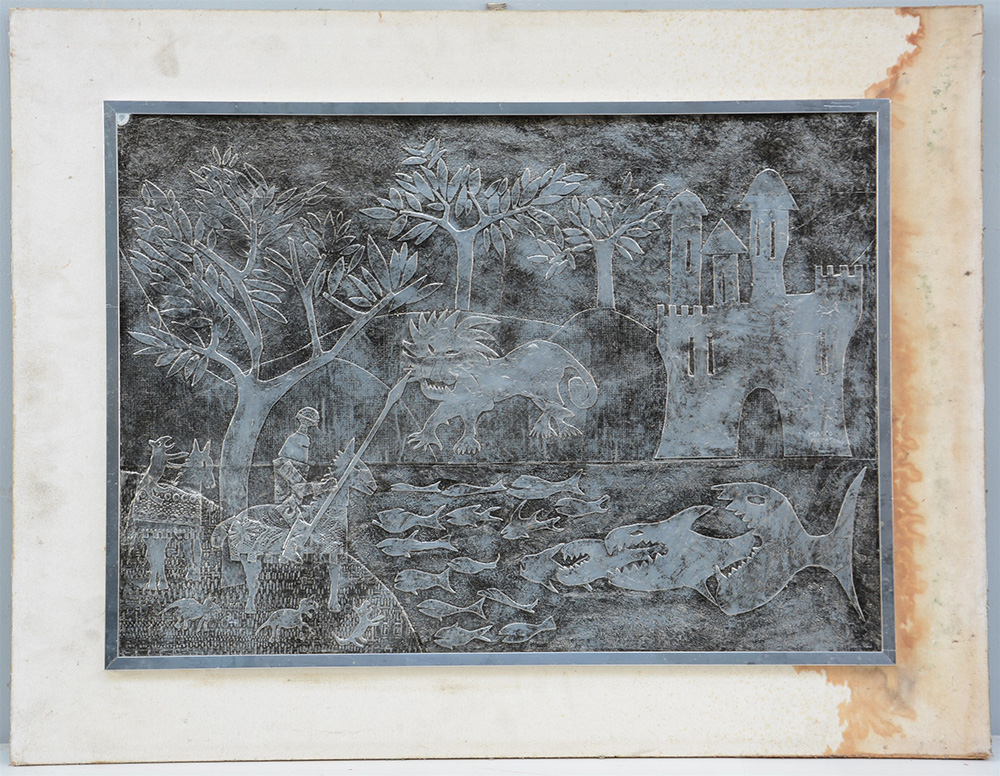 "Ritorno" foglio di alluminio sbalzato (cm 50x70) titolato e firmato al verso, entro passepartout (difetti)