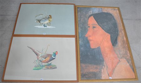 Lotto composto da una coppia di riproduzioni raffiguranti un’anatra e un fagiano (fogli cm 48,5x69) ed una raffigurate un'opera di Modigliani (cm 95x55) in cornici (difetti)