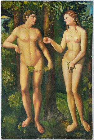 Ignoto, "Adamo ed Eva" olio su tela applicata su compensato (cm 91x60,5)...