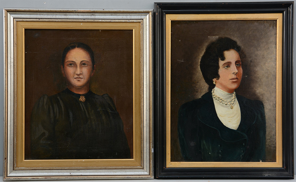 Lotto di due dipinti ad olio su tela raffiguranti ritratti femminili, di artisti differenti, firmati e datati 1909 e 1918, in cornici (difetti)