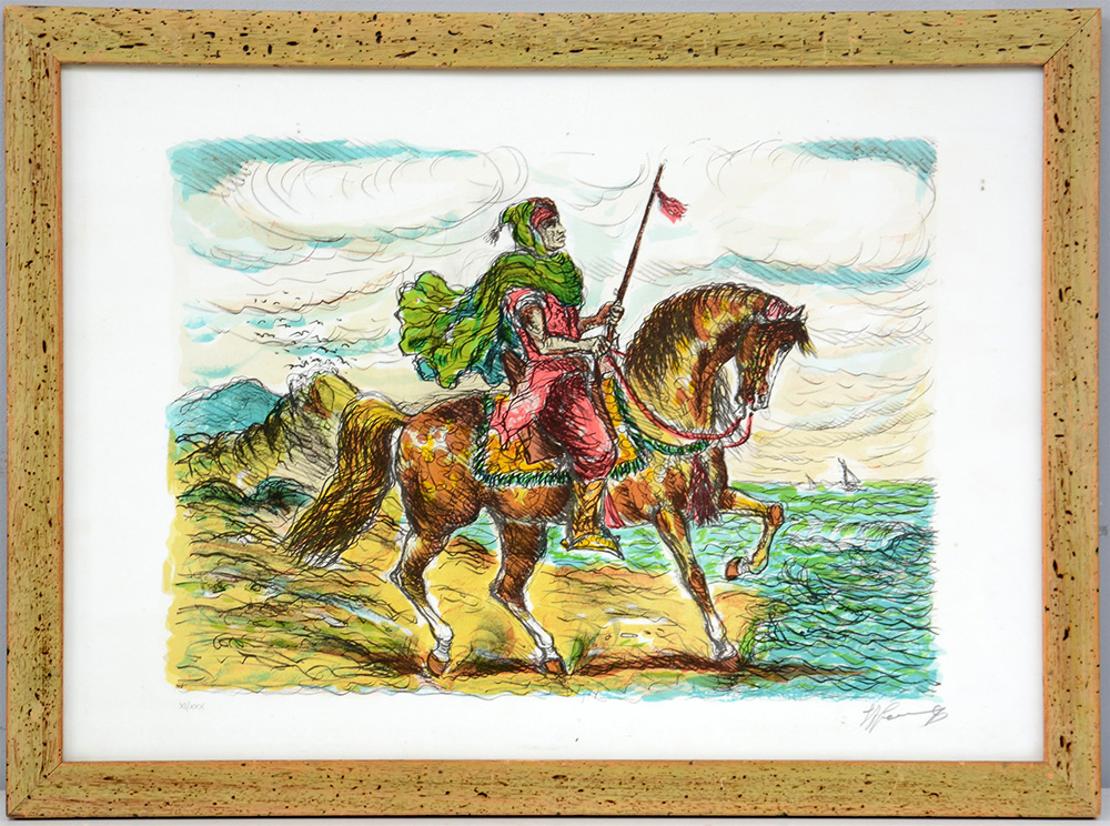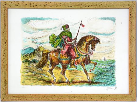 Firma incecifrata, "Cavaliere" litografia (foglio cm 49x69) esemplare XI/XXX, firmato a matita in basso a destra, in cornice (lievi difetti)