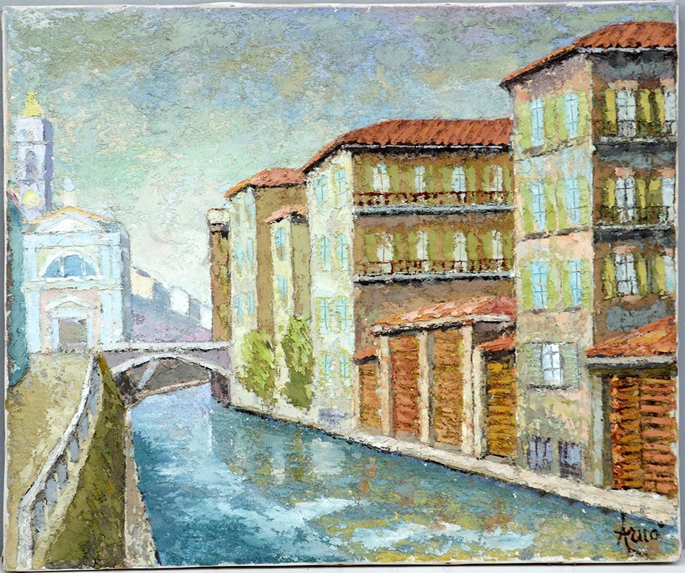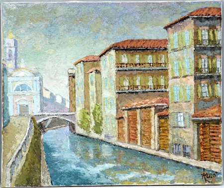 "Milano, scorcio del Naviglio" tecnica mista materica su tela (cm 50x60) firmato in basso a destra (lievi difetti)