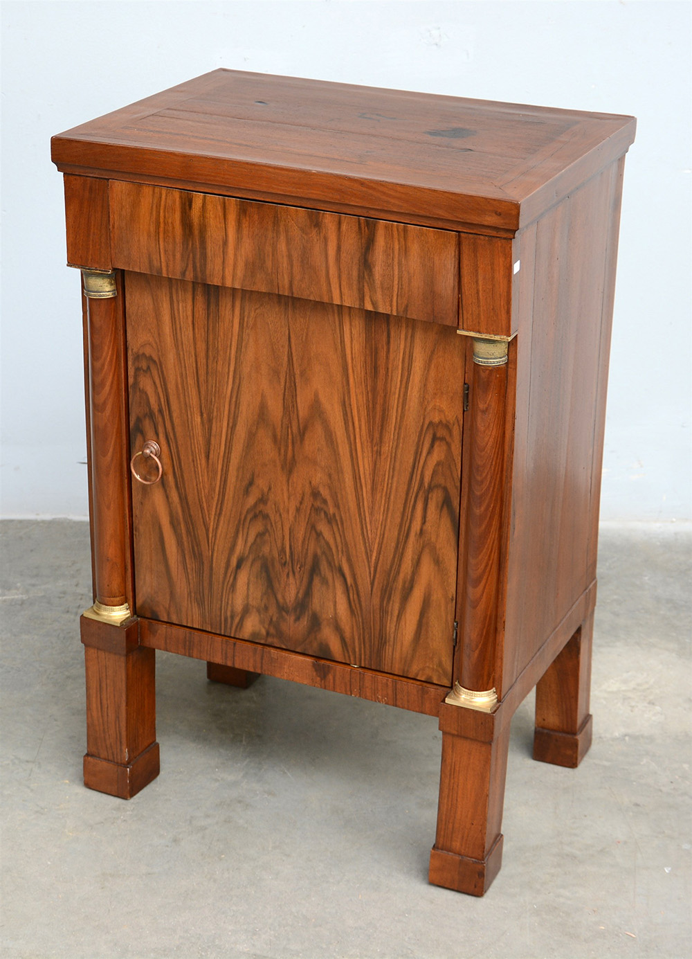 Comodino impero in noce ad un cassetto e uno sportello, semi colonne laterali con capitelli in bronzo dorato, piedi a plinto. Secolo XIX (cm 52x79x37) (difetti e restauri)