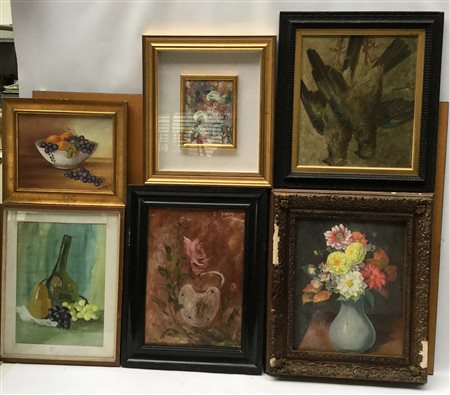Cartone contenente otto quadri raffiguranti nature morte; autori, tecniche e misure differenti, in cornici (difetti)