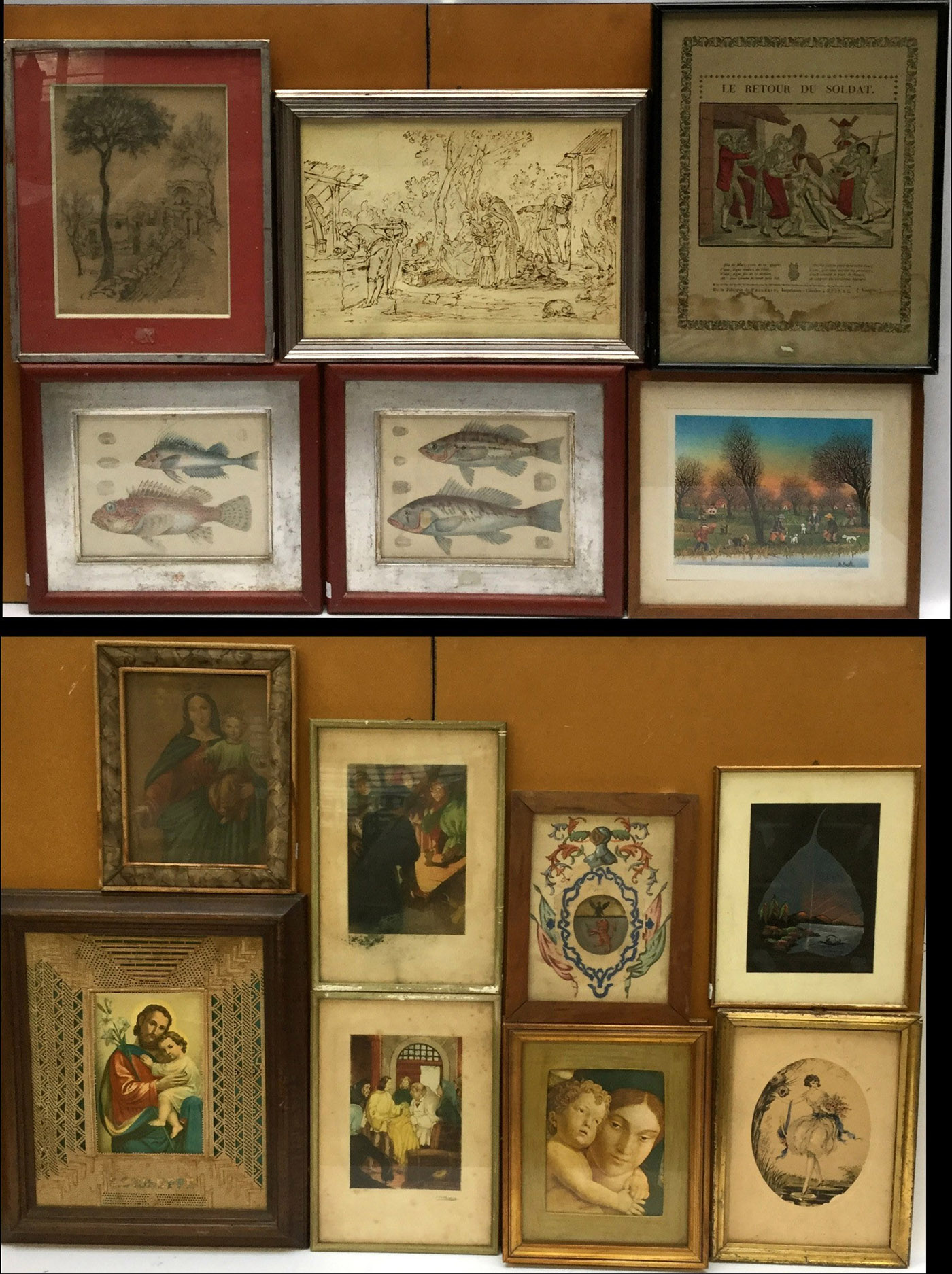 Lotto di due cartoni contenenti quadretti e fotografie; soggetti, tecniche e dimensioni differenti (difetti)