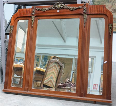 Specchiera per comò tripartita in legno con specchi bisellati e guarnizioni in bronzo (cm 123x105) (difetti)