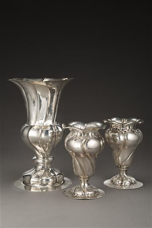 Lotto composto da tre vasi in argento di stile veneziano con corpo spiralato....