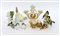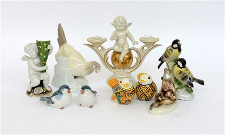 Lotto composto da un candelabro a due fiamme, un amorino con vaso e sette sculture in ceramica raffiguranti animali (h max cm 19) (difetti)