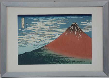 Xilografia a colori raffigurante monte Fuji con calligrafia, in cornice...
