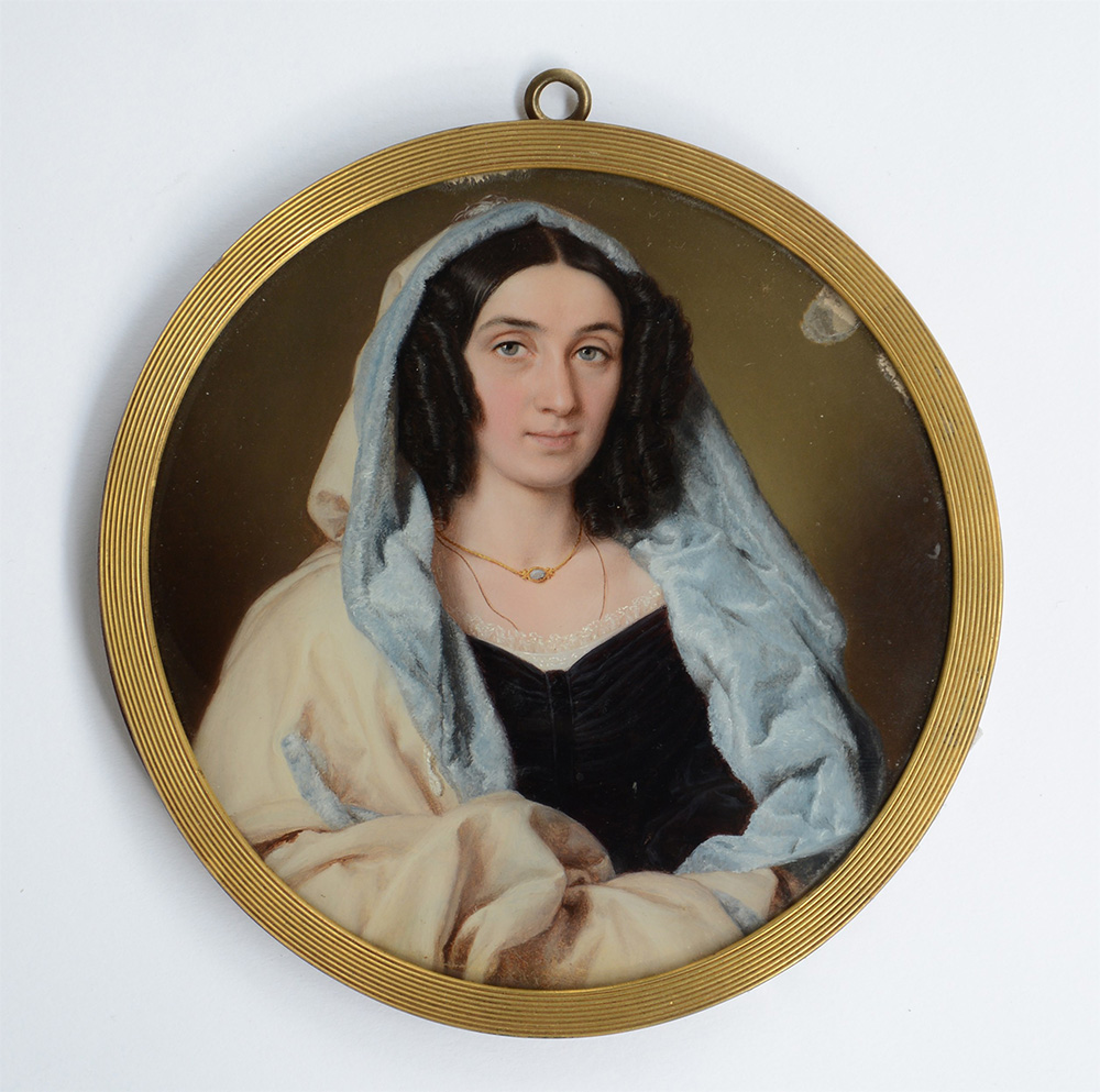 Miniatura tonda raffigurante una gentildonna (d cm 12,5) dipinto su carta incollata su tela, in cornice (difetti)